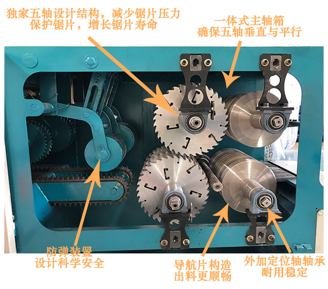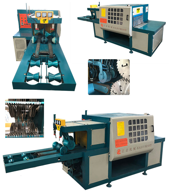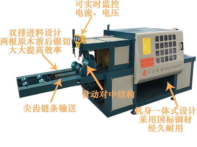 ZQ250型雙排鏈原木多片鋸是針對原木鋸切而設計的專用機床,采用五軸結構設計-前鋸后導航確保木板的精確度,無論木板長短均可保證鋸切木材尺寸公差在0.2mm-0.5mm之內,尺寸標準偏差小,節約木料,上下鋸軸,鋸片采用進口帶刮刀鋸片,鋸切表面光滑,無需再刨,不燒鋸片。采用自動分中裝置,提高木材的利用率;上壓輥主動增加壓力,送料平穩.軸心噴水冷卻鋸片,去脂降溫,增強鋸片的使用壽命。一次多片,大大提高工效;