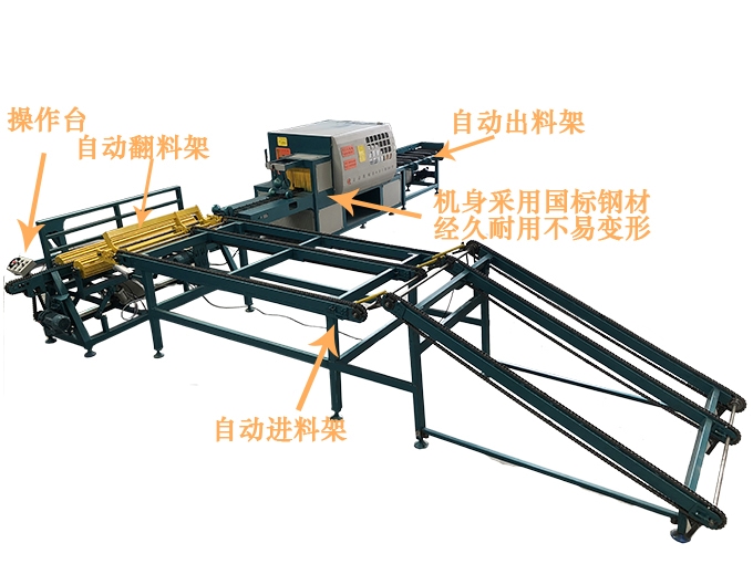 料:采用四排尖齒鏈條輸送,機上配有變頻智能調速器,可以對大小木料的進料速度實行自由調速。原木可以實現自動分中,機上還配有限位開關,防止超去規格木料進入,防止卡木避免對機器造成損壞。
